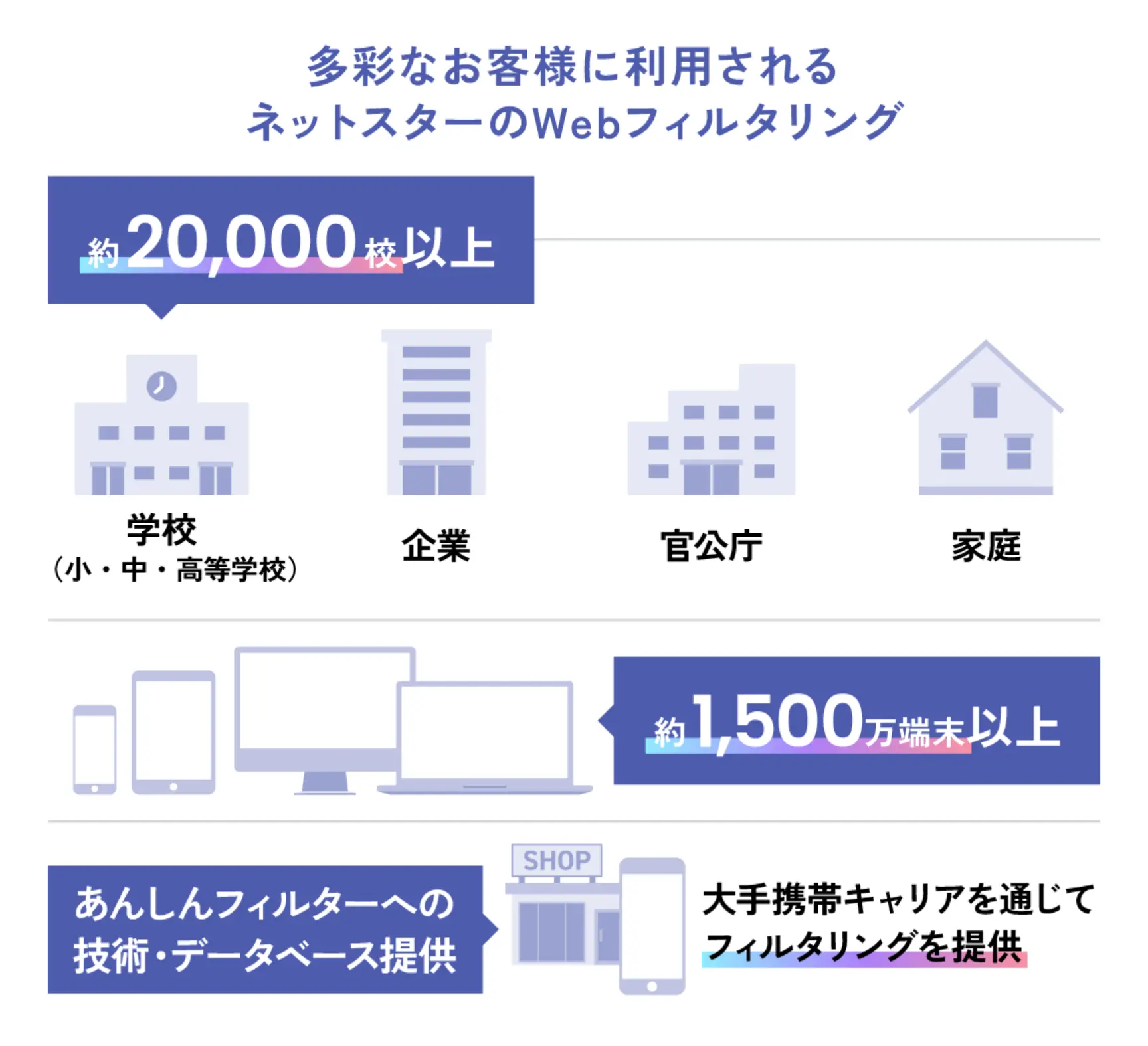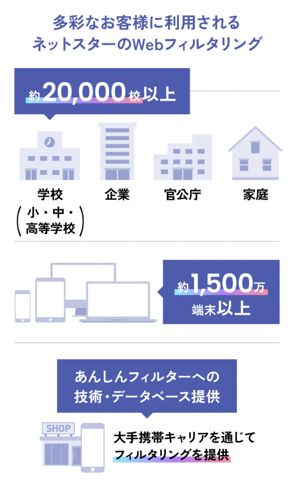 Webサイトへのアクセスを管理する「Webフィルタリング」。私たちネットスターは、実は、日本初の国産フィルタリングソフトを開発した会社です。学校から官公庁、そして企業まで。さまざまなお客様により良いサービスを提供するためにスタンダードをアップデートし続ける、という終わりのないミッションに挑んでいます。