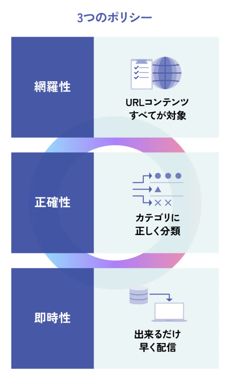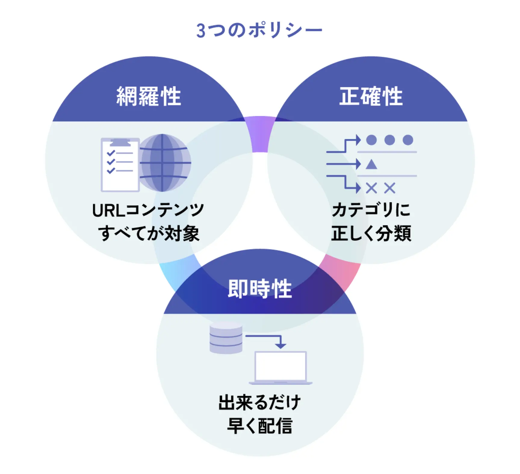 次に「正確性」です。正しく分類することを意味し、現在約150のカテゴリに基づきURLコンテンツを分類しています。かつては約80のカテゴリしか存在しませんでした。時代の変化に合わせてカテゴリの細分化・再構築を実施し、さらに定期的に全項目を見直すことを通じて、常に世の中の認識と相違のない分類を心がけています。また、独自開発したURLの自動判定を行えるAI技術を活用していますが、最終的な分類は「人の目」で実施。国内最大級のリサーチセンターを運営し、24時間365日、経験豊富な専任リサーチャーが目視でチェックする体制を整えています。
