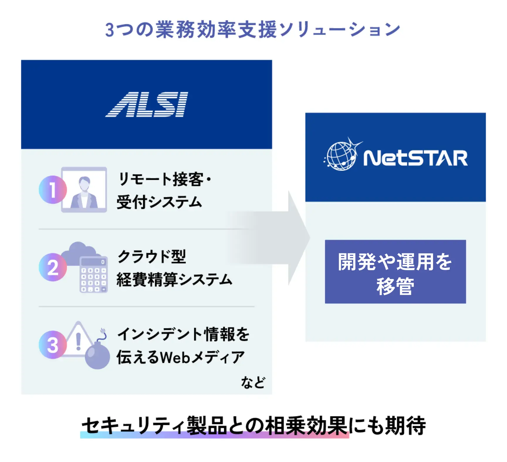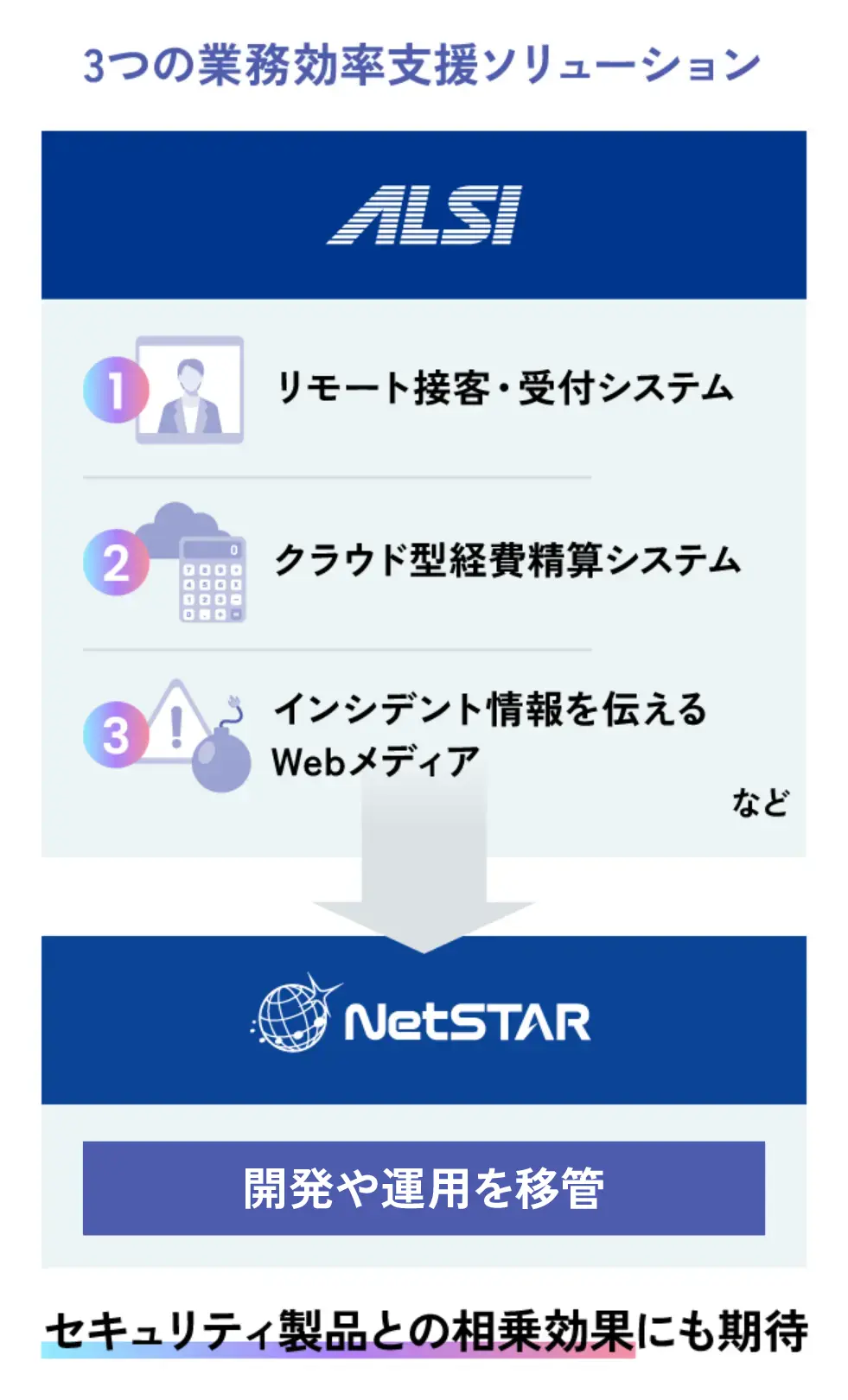 技術の深化を追求するネットスターにとって、ALSIが持つ幅広い技術を受け継ぐことは、業務効率支援の枠を超えた大きなメリットをもたらします。その理由は、元々私たちが培ってきたセキュリティ分野の強みと結びつき、新たな相乗効果を生みだす基盤になるからです。