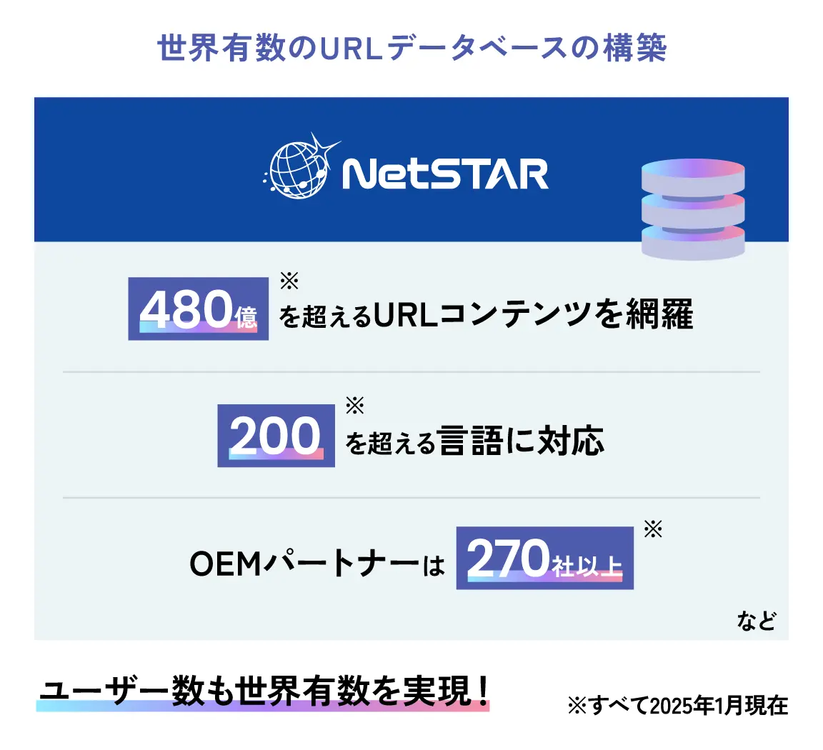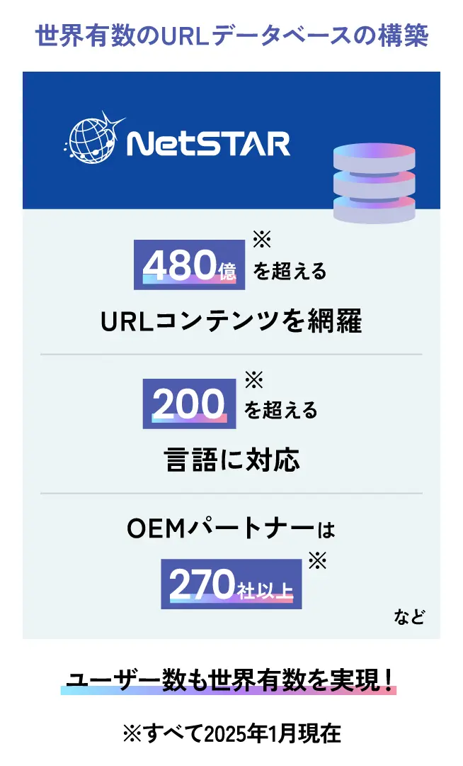 私たちのグローバル展開は米国を皮切りに、欧州、そしてアジアへと広がりました。現在、ネットスターのデータベースは世界でも有数の規模と利用実績を誇っています。480億※を超えるURL、ドメイン、IPアドレスをカバーし、200以上※の言語に対応。さらに、270社※を超えるOEMパートナーとの連携を実現しています。