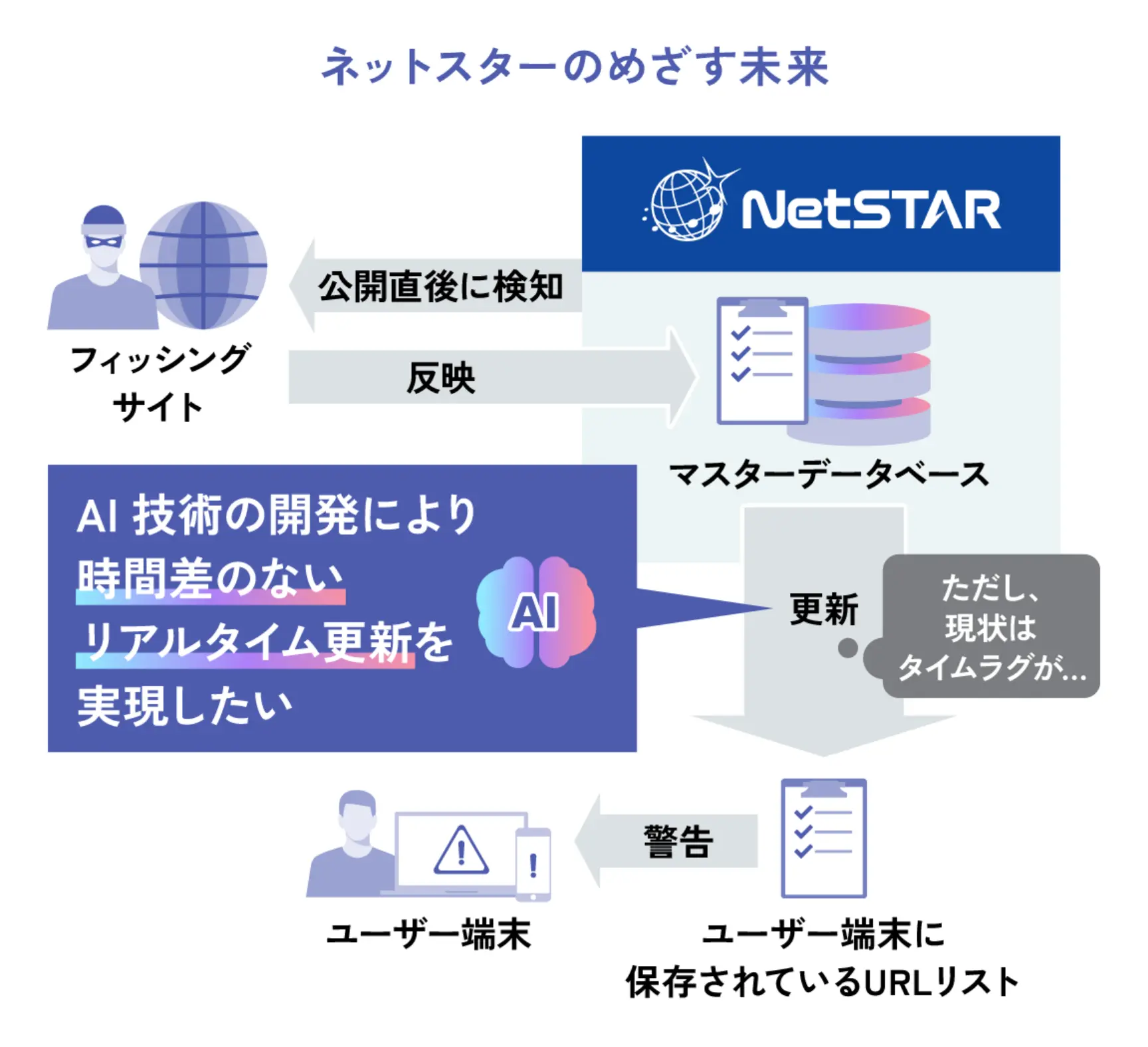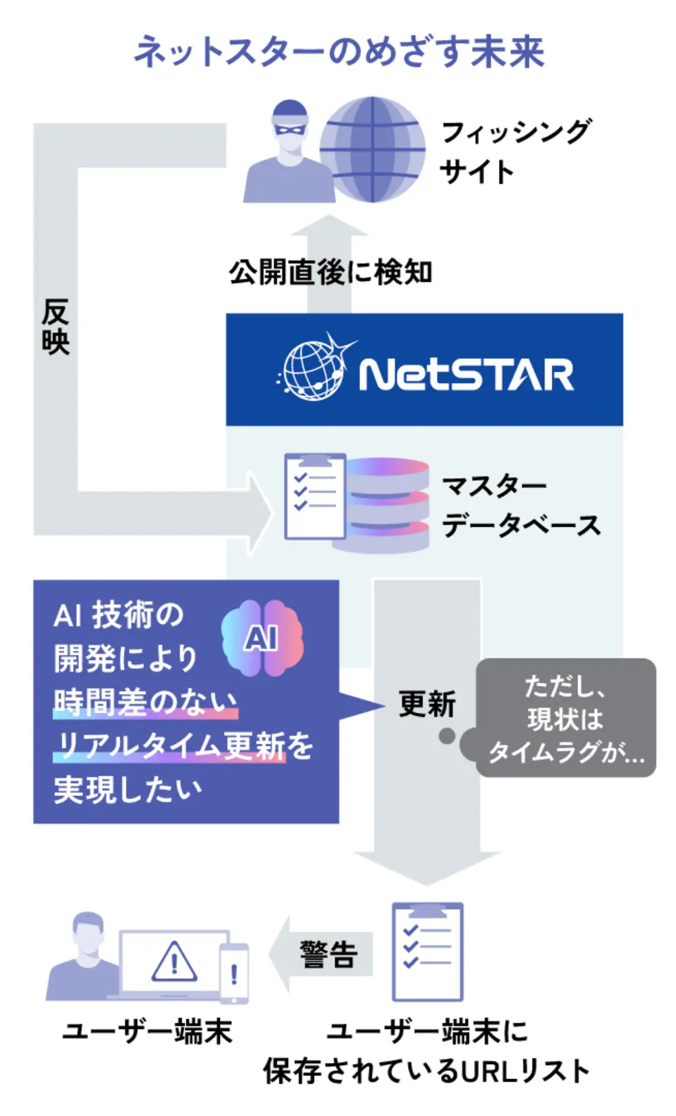 その一環として取り組んでいるのが、次世代AI技術の開発。フィルタリング情報をリアルタイムでお客様のデータベースに反映させる仕組みの実現です。現在、米国ミシガン大学と共同研究を進めています。たとえば、現在の技術でもフィッシングサイトが公開した瞬間にその存在を検知することは可能です。実在する企業を想起させる偽URLのWebサイトもリアルタイムで察知できます。しかし、検知した情報をマスターデータベースに反映し、お客様の環境に配信するにはどうしてもタイムラグが生じてしまいます。そこで私たちは、AI技術をさらに進化させ、お客様自身が自社環境内で即時にURLコンテンツの分類や判定を行える未来を構想しています。